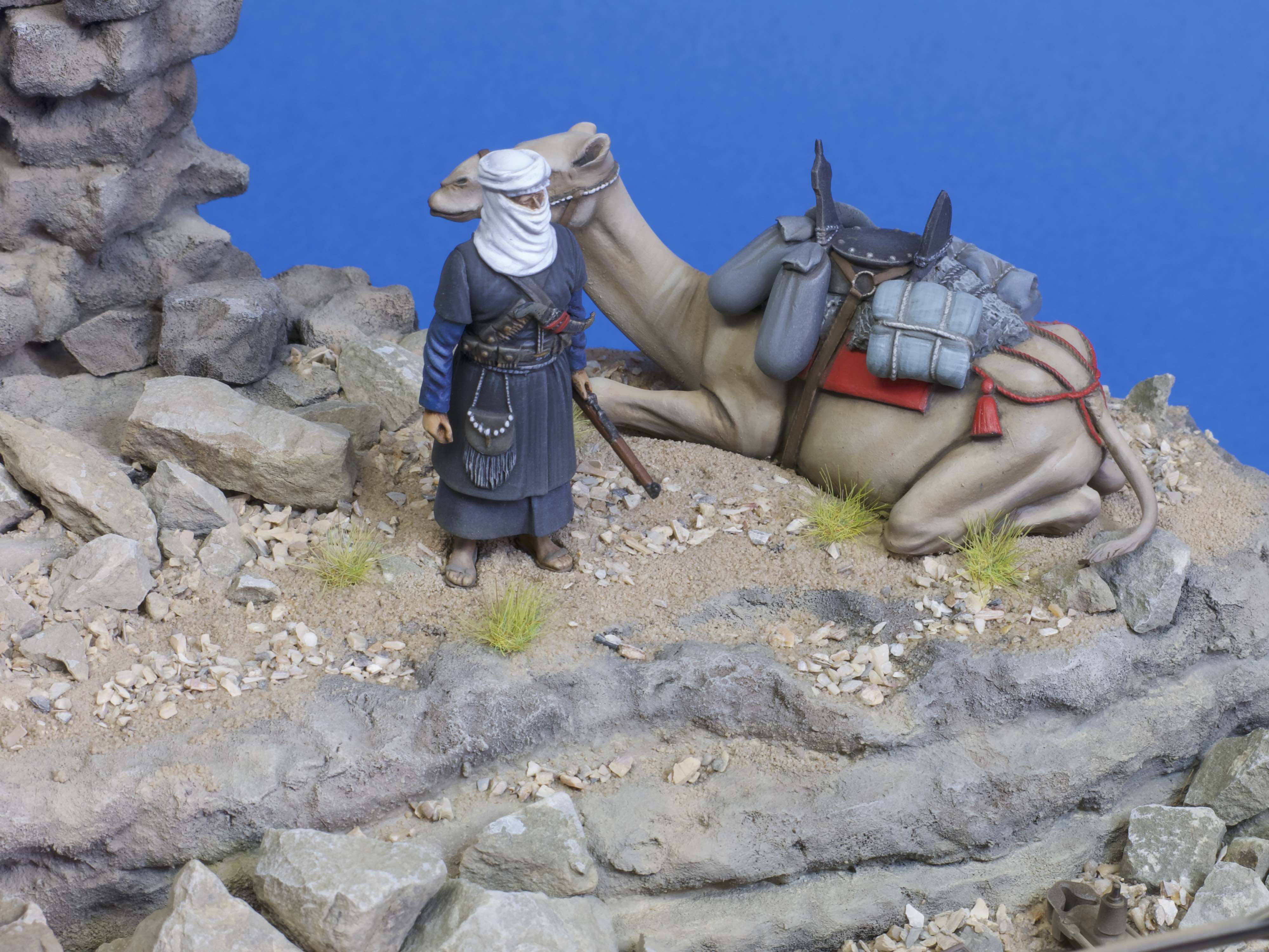 The challenge was to create a rocky landscape that could then be decorated with both the gun and one of VP’s Bedouin and Camel sets to produce a quiet, abandoned scene. As it turned out, the groundwork was a real headscratcher, but I think it has worked out, fitting in nicely with the Verlinden ideas for finishing and accessories, that is such an important part of this ongoing series of models. One thing though: the use of real rocks has made this, one heavy diorama!