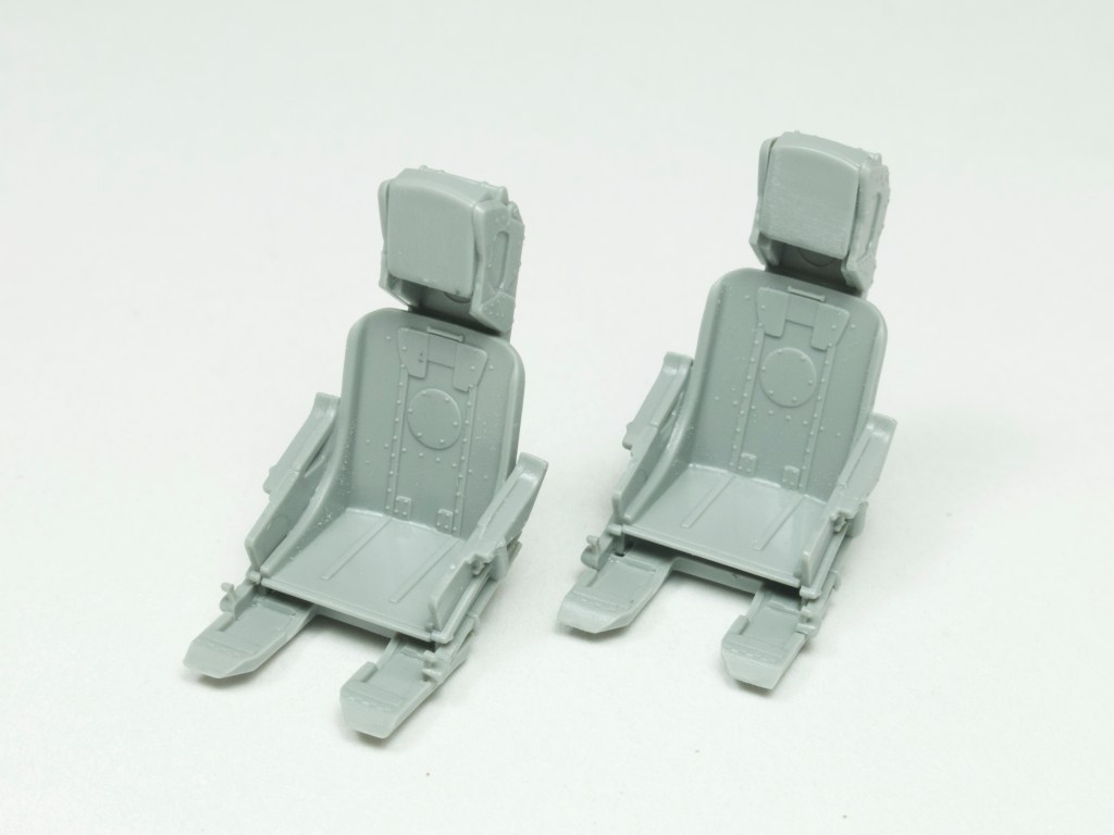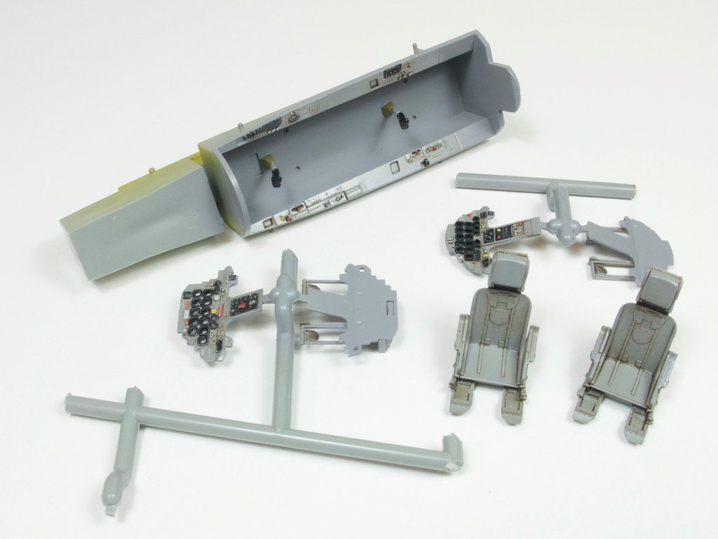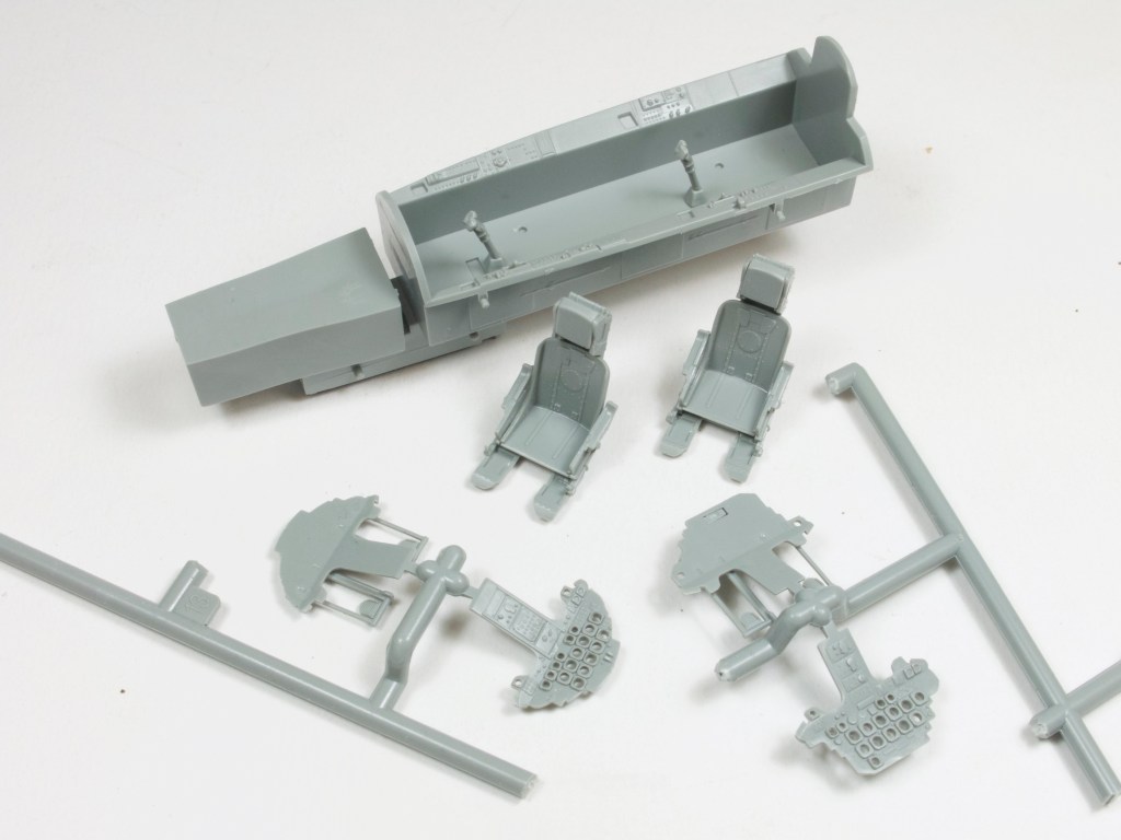 The cockpit is similarly impressive. Instrument panels and side consoles partner multipart ejection seats to great effect. The instrument panels are moulded in two parts, front and rear, these two plastic pieces trapping a decal that replicates the instrument faces. Good idea, failure in practice. When this was done for the review build, the depth of the instrument bezels on each panel was such that nothing could be seen through each one. Reducing the depth of the bezels may help, but I did nothing to mine, painted the whole lot black, dropped some Kristal Klear into each one and moved on…