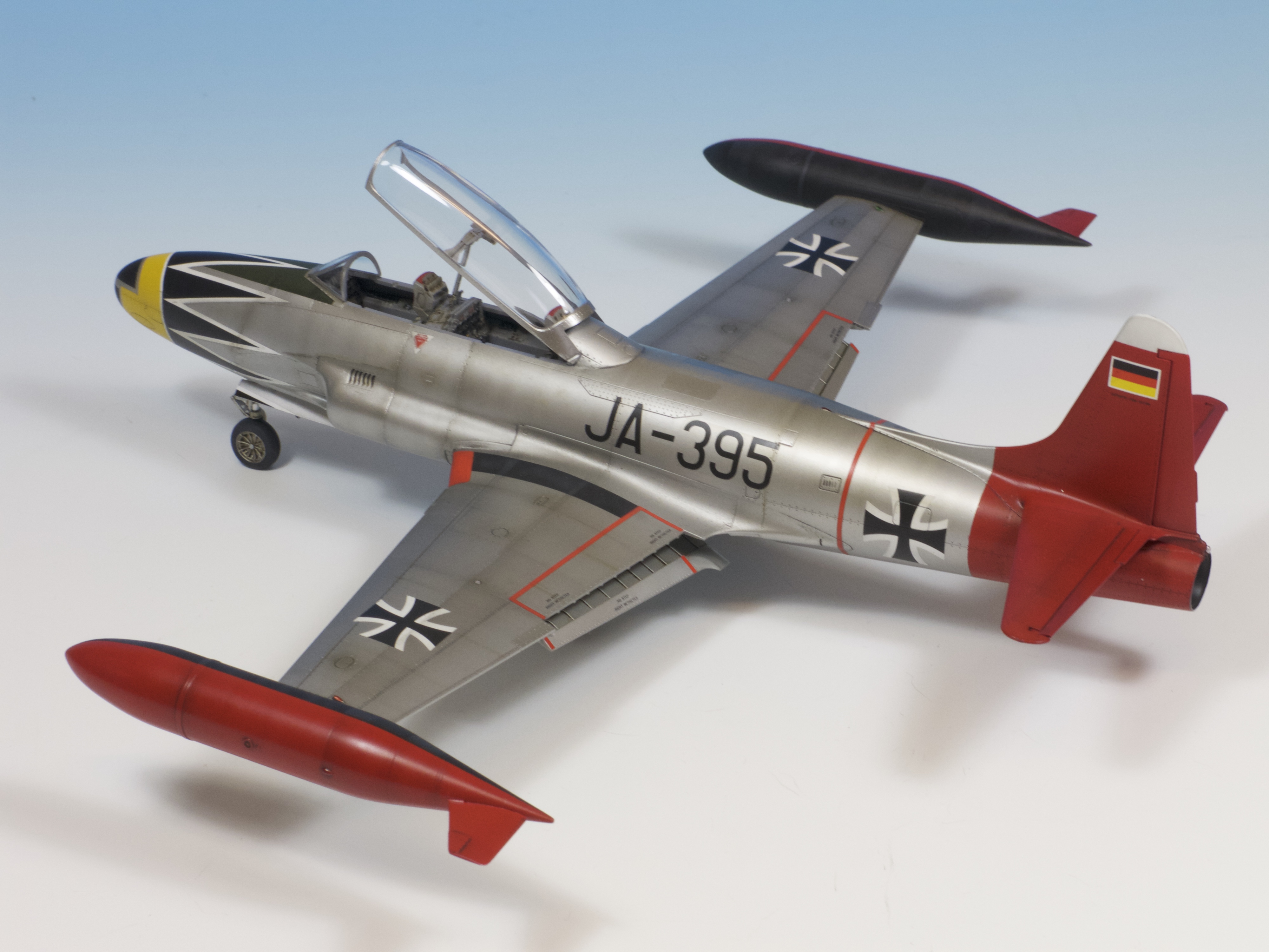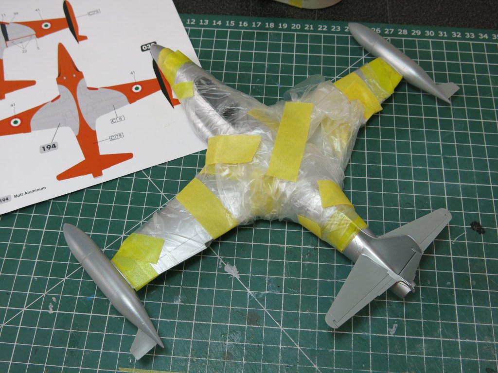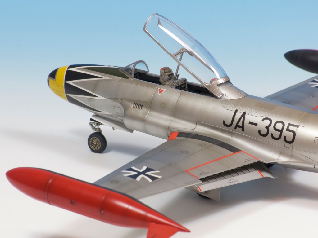 The decals are well-printed and in this kit at least, perfectly in register. The choices are interesting and colourful, the Italian build in its orange and silver plumage being particularly gaudy! Having never built a post war Luftwaffe aircraft, this was the one chosen for this feature, the silver and red colours suiting the shape of this aircraft perfectly.