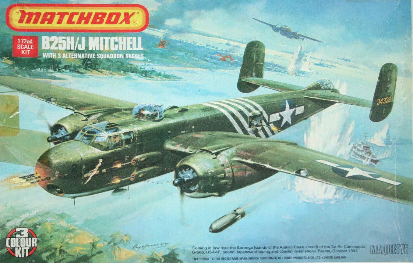 Many modellers’ favourite, perhaps mine included. This is a very impressive painting, that despite having the subject horizontal on the box, has the horizon at an angle, suggesting this aircraft is rolling in for an attack. It’s just so full of speed and action, incredibly exciting for those young modellers that Matchbox were keen to attract. I might not have been aware of the Mitchell before seeing this kit, but as soon as I did, the aircraft become a firm favourite. Today, it remains in my top five Second World War aircraft.