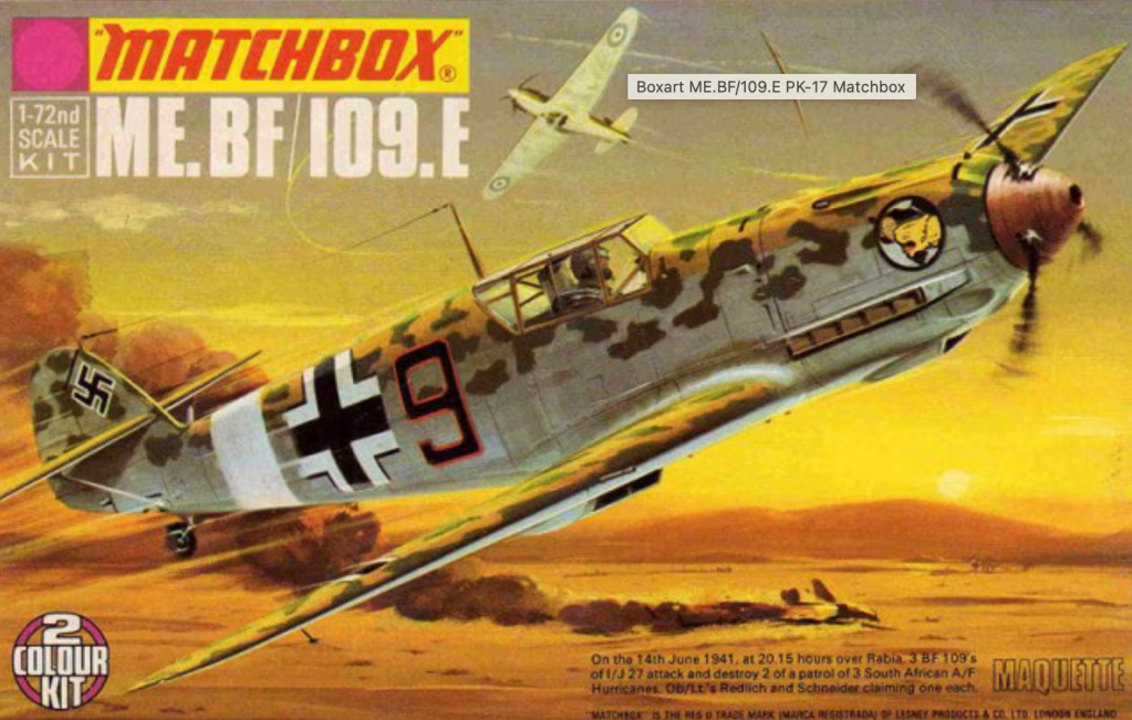 I can never get past how perfect the lighting is in this painting. It works so perfectly with the mottled camouflage on the aircraft, I’ve often wondered if it could ever have been improved. The motion lines streaming from the rear of the ‘109 that impart the illusion of high speed, the Hurricane in the air and the crashed machine on the desert floor, only add to what to me at least, is an almost flawless kit box painting.