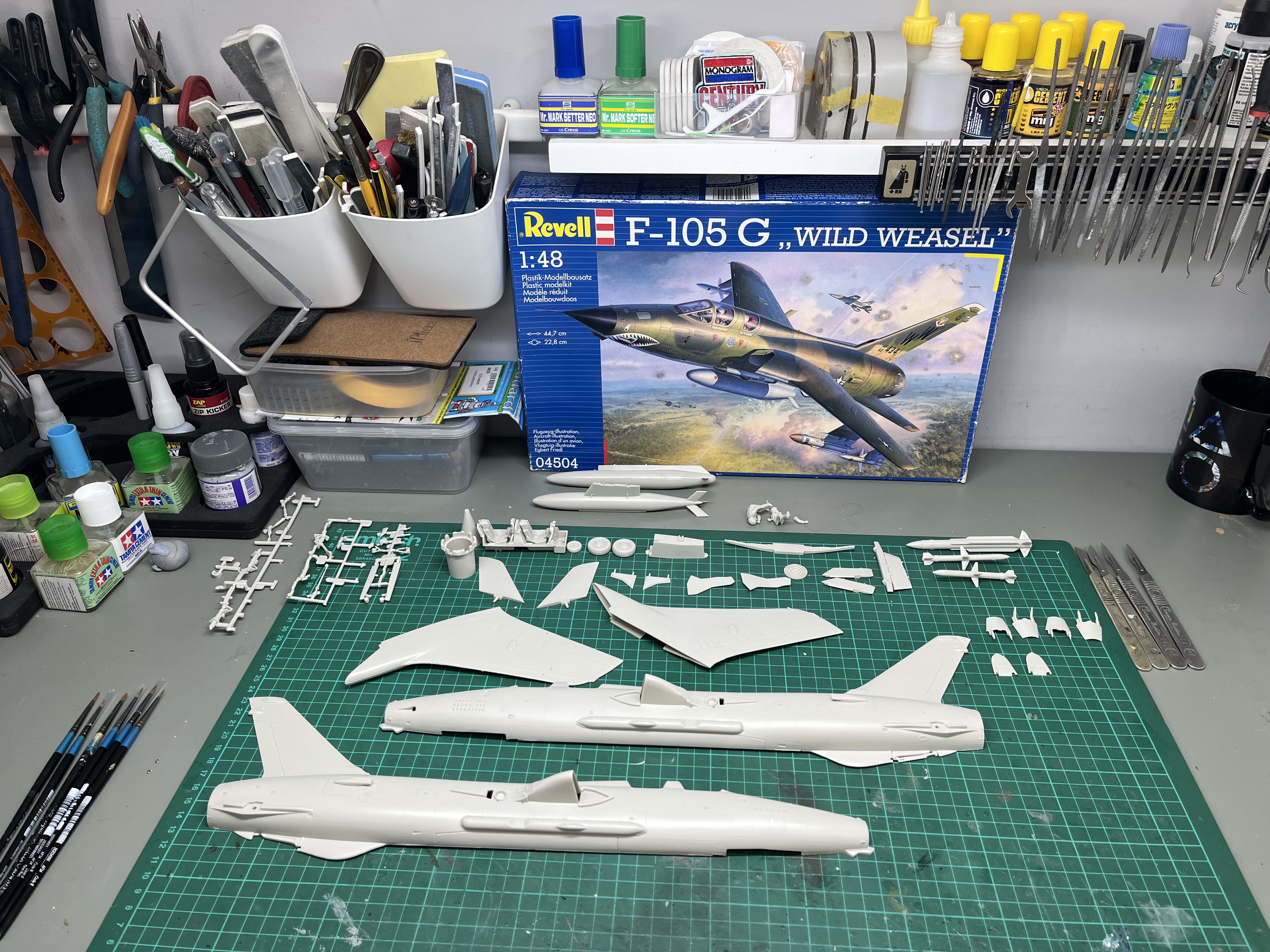 As you will no doubt know, aircraft often comprise dozens of small bits that you need to painted separately and then brought together. Anyone that is sensible (or indeed enjoys their life and the relaxation that hobbies can provide) will work through an aircraft kit slowly, building small parts, painting them and then moving on. Not this idiot. No. I have to build up everything to create as many sub-assemblies as possible, then paint them all in one go thus creating a mass of parts that not only have to be housed on my far from large workbench, but then have to be painted in one confusing and often frustrating session.