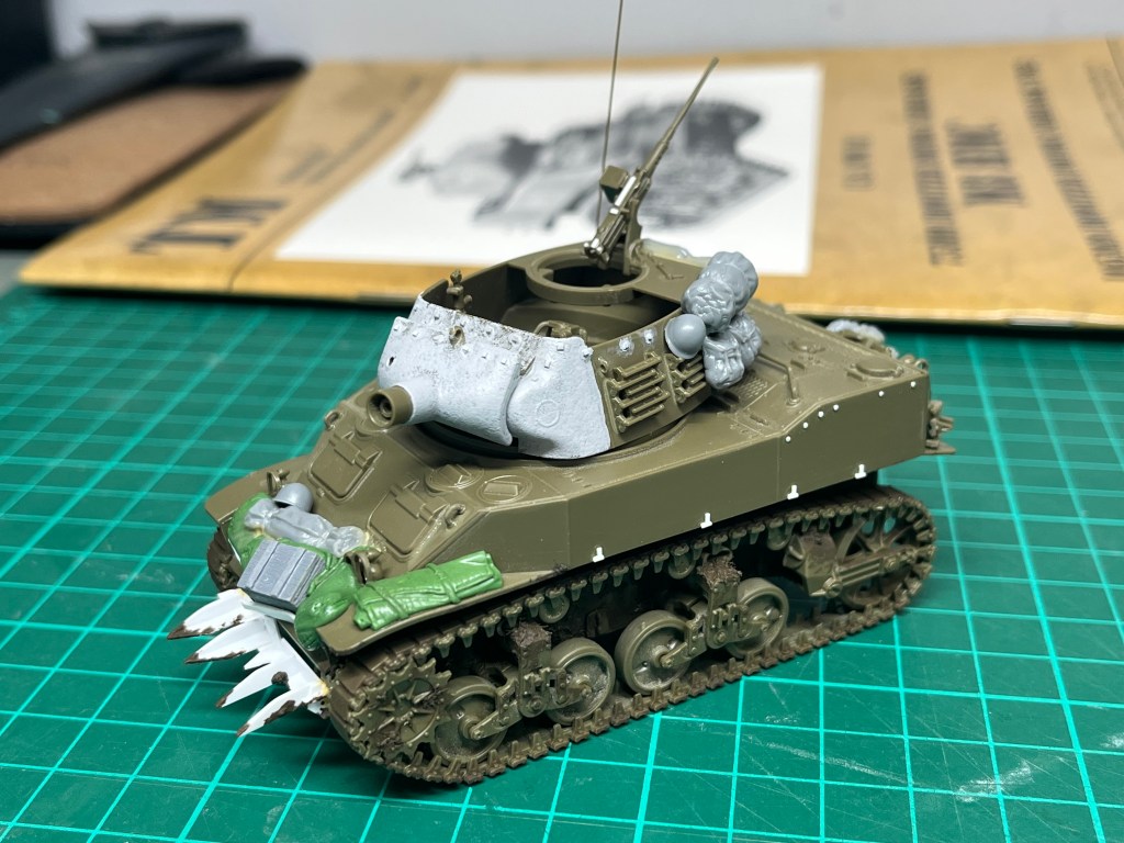 So, as it stands, I have an enormous pile of parts in my studio that I have at least made a start on. They’ve been primed in colours that are close to their final finish so at least I feel like I’m making some headway, even if truth be told, I am not. Tomorrow, once these initial layers are dry I can begin to deal with some detail painting and then hopefully, start to bring it all together. That’s the plan at least, but if I’m honest (and this is the place to be that) I’m bound to find some way to make my life even more complicated because I’m already confused and have lost track of what is what. I’m relatively sure that it will all come together at some point, though that conviction is rather tempered by the fear that I will lose at least one of those small parts that are now on my desk, rather than safely homed as part of the kit’s wonderful sprues, safely tucked away in the kit box…