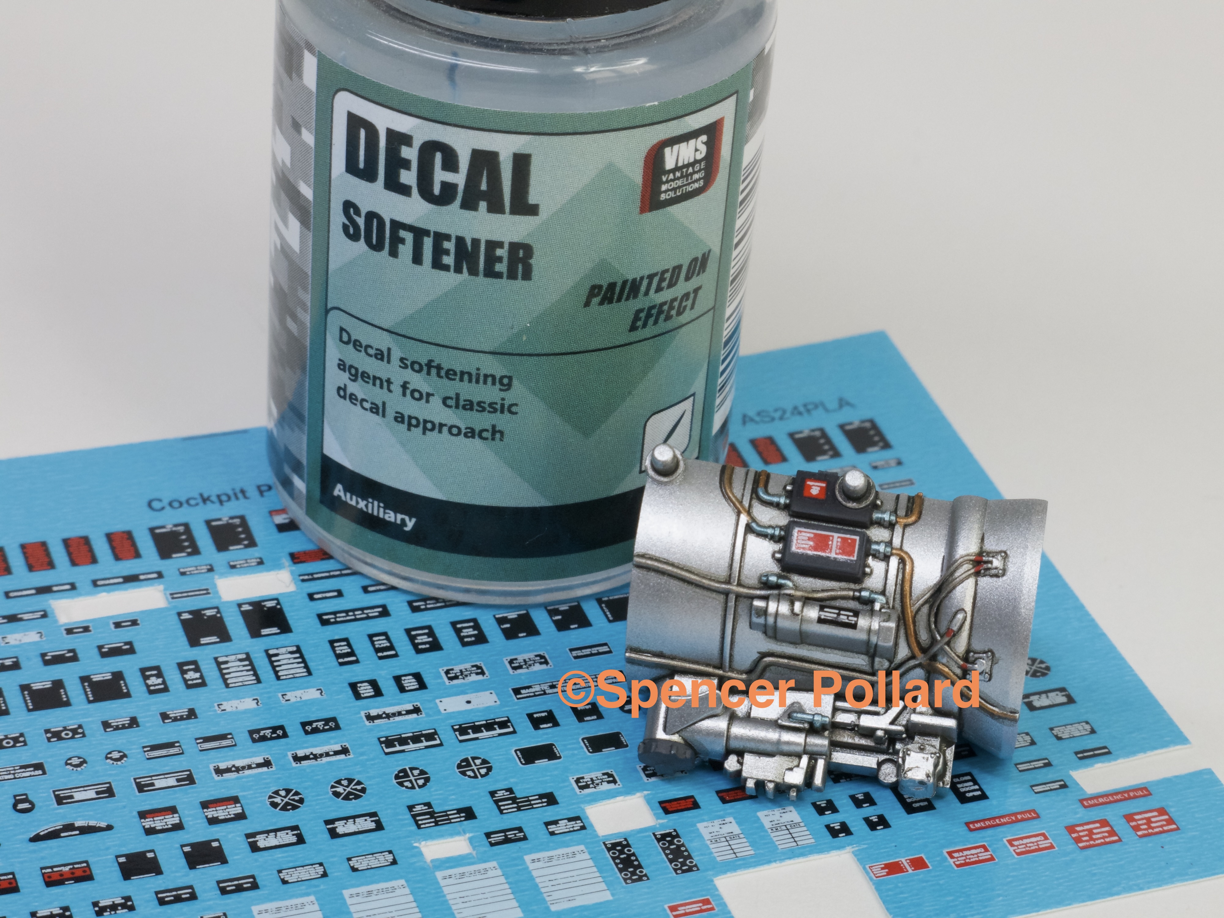 I mentioned yesterday that I had painted the model and then applied what I still consider a necessary layer of gloss to help the decals to lay properly over the surface of the model, without having to worry about silvering. My coat of LP Clear certainly made that possible, a soft flat brush being used to remove any water and air trapped under the decals to a pleasing degree. All I then had to do, was using my collection of setting solutions (my current favourite being VMS Decal Setting Solution), snuggle the markings down into and over the surface detail. I don’t use the solutions to eliminate silvering, that’s the job of the gloss coat.