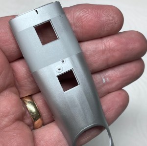 Though the application of the paint was fairly easy in the end, I spent some time experimenting with colours to ensure that there would be a differentiation between the fabric, metal and what appear to be wood(?) areas on the aircraft. This involved mixing the fabric colour from LP11 Silver, and XF80 Royal Light Grey (five parts silver, one part grey) the natural metal from decanted AS12 Bare Metal Silver and then odd panels from LP38 Flat Aluminium. Here, you can see how those colours play with each other on the spare rear deck: AS12, LP11/XF80 and finally, LP38. The differences are pleasingly noticeable so having checked their tonal relationship, I was happy to apply them to the model.