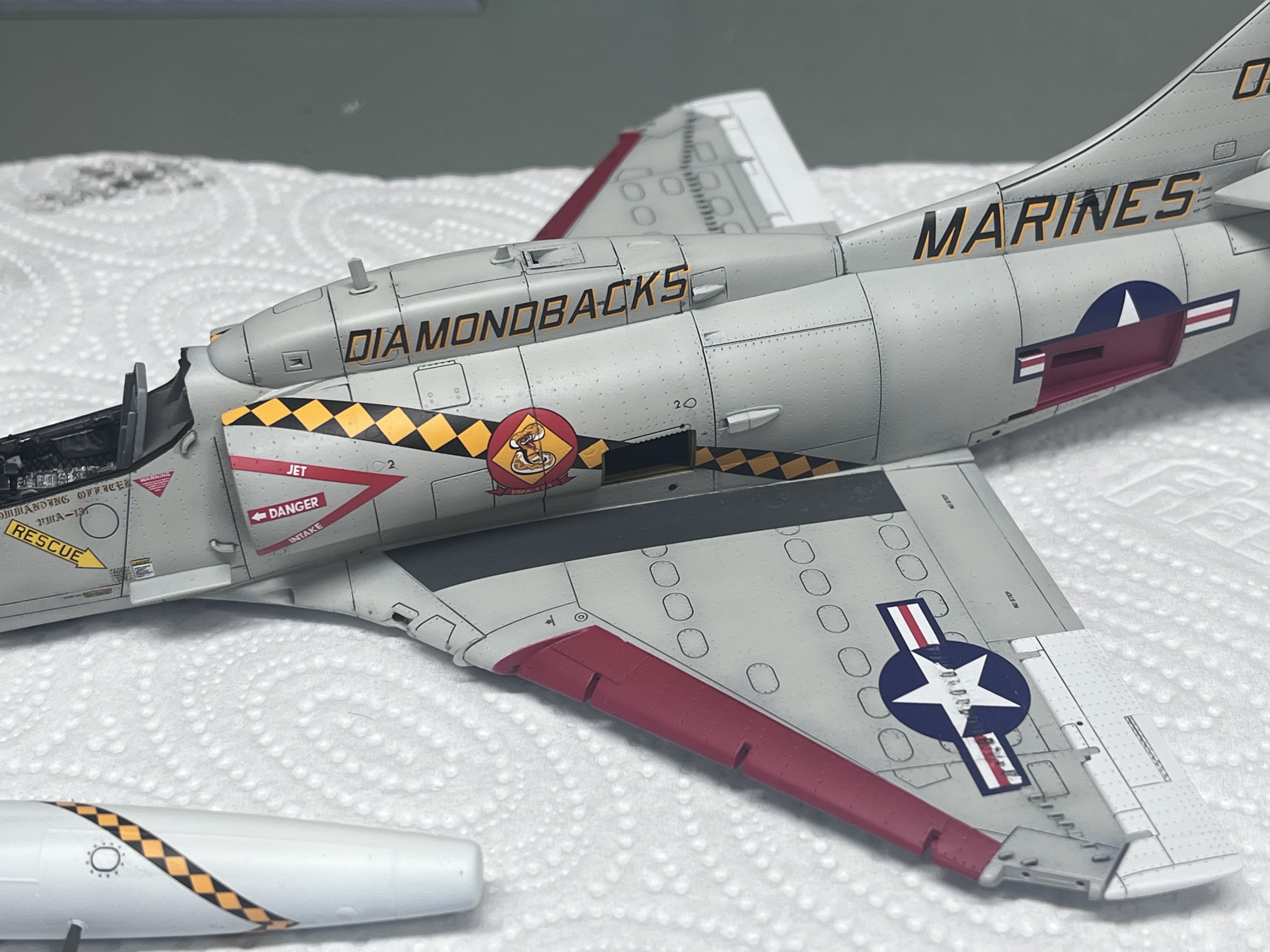 Speaking of artistic licence, the Skyhawk is now almost complete, today involving the washing of the panel lines to bring them out. Despite the real machine being pretty-much immaculate whilst in the scheme that I’ve chosen, I wanted to define those surface details, so used a Panel Line Wash to shade each one.