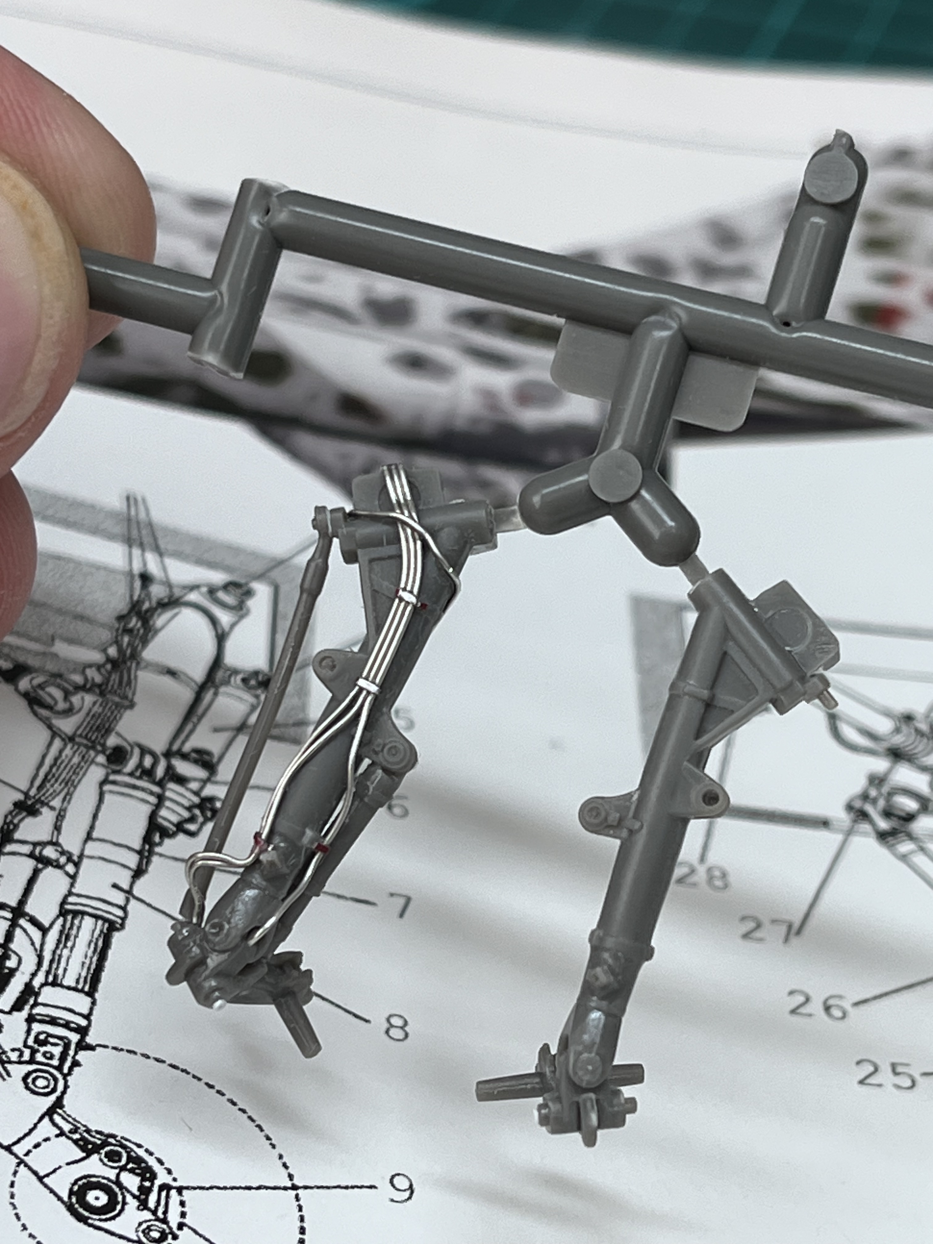 In other news, I have made a start on the Airfix Jaguar of sorts, adding a few details to the main gear legs. I don’t normally warm up on details such as this but was rather taken by the idea of adding the prominent hydraulic pipes that festoon each one. They seemed rather obvious to me, so I broke out the lead wire and started to plumb each leg as the sun shone and the birds sang in the garden.