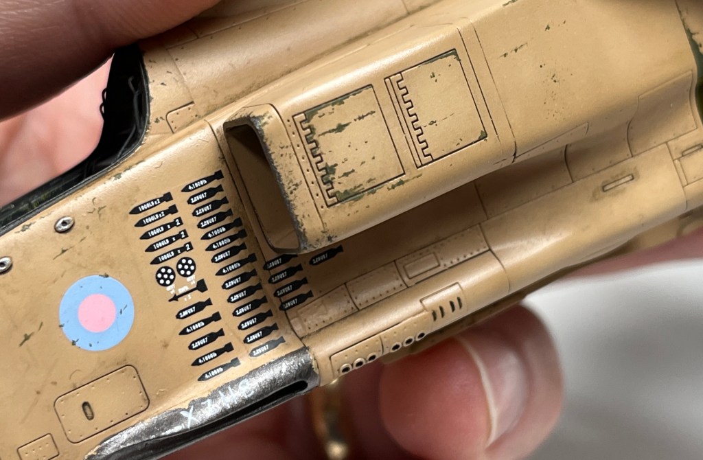Along with the smaller bits and pieces, I’ve also worked on the weathering or more particularly, the paint chips. My reference images showed these to be very restrained on the jet I was modelling with distinctive patterns of wear. As this was something that I was keen to replicate, I spent some time checking out my reference images and then trying as closely as possible to replicate what I could see. More AK acrylics, some sponges and a fine brush, dealt with this step in the model’s construction and painting.