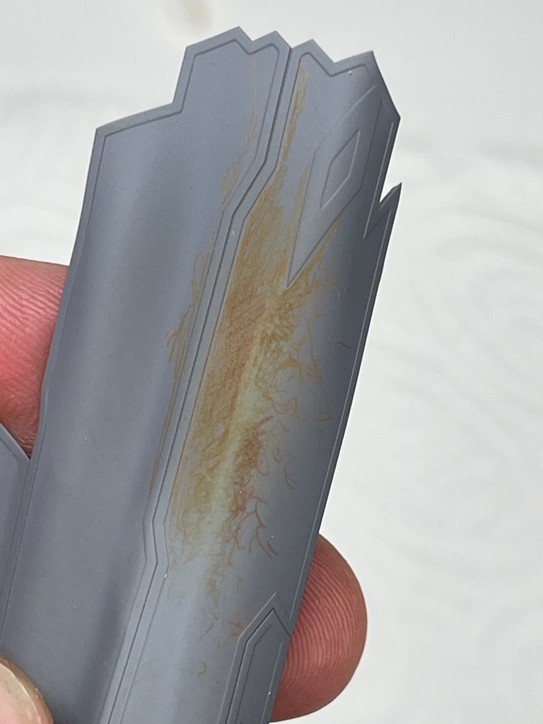 This entails replicating the oddly ‘rusty’ look that the jets seem to have taken on onboard ship, their upper flanks appearing to show an almost gold patina that contrasts well with the surrounding grey paintwork. Truth be told I had no idea how to do this, but I’ve now settled – after some experimentation – on replicating this corrosion with a mixture of coloured pencils and oil paints. Below you can see me playing with the ideas on one of the closed weapons bay doors, with both the pencilled stains and those created with pure oils, now in place.