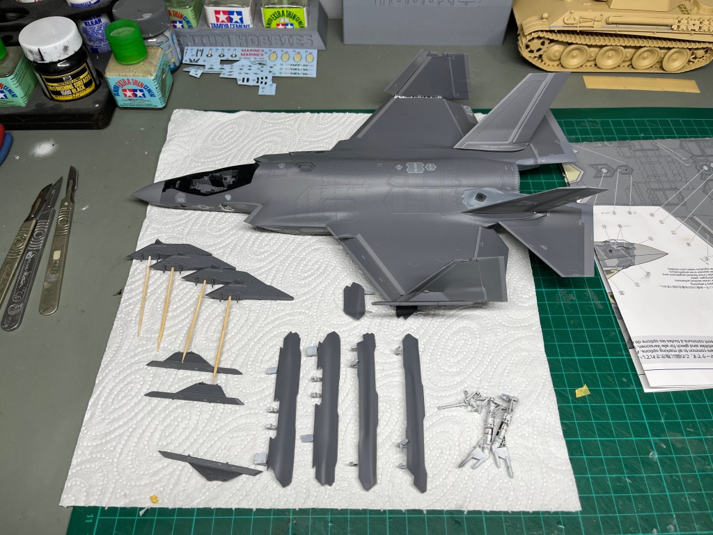 Along with that work, I’ve also finished the painting of my F-35C. All that remains is to weather it and then glue everything together. So far it’s looking pretty good, though there are a couple of slightly ragged areas where my need to rush the paintwork has resulted in less than perfect work. I doubt anyone but me will notice the mistakes, but it is still annoying that everything was not quite how I wanted it to be! No doubt the weathering will cover up some of the issues, but I’d still rather it be close to presentable at this point, rather than have to chase my tail over the next few days!