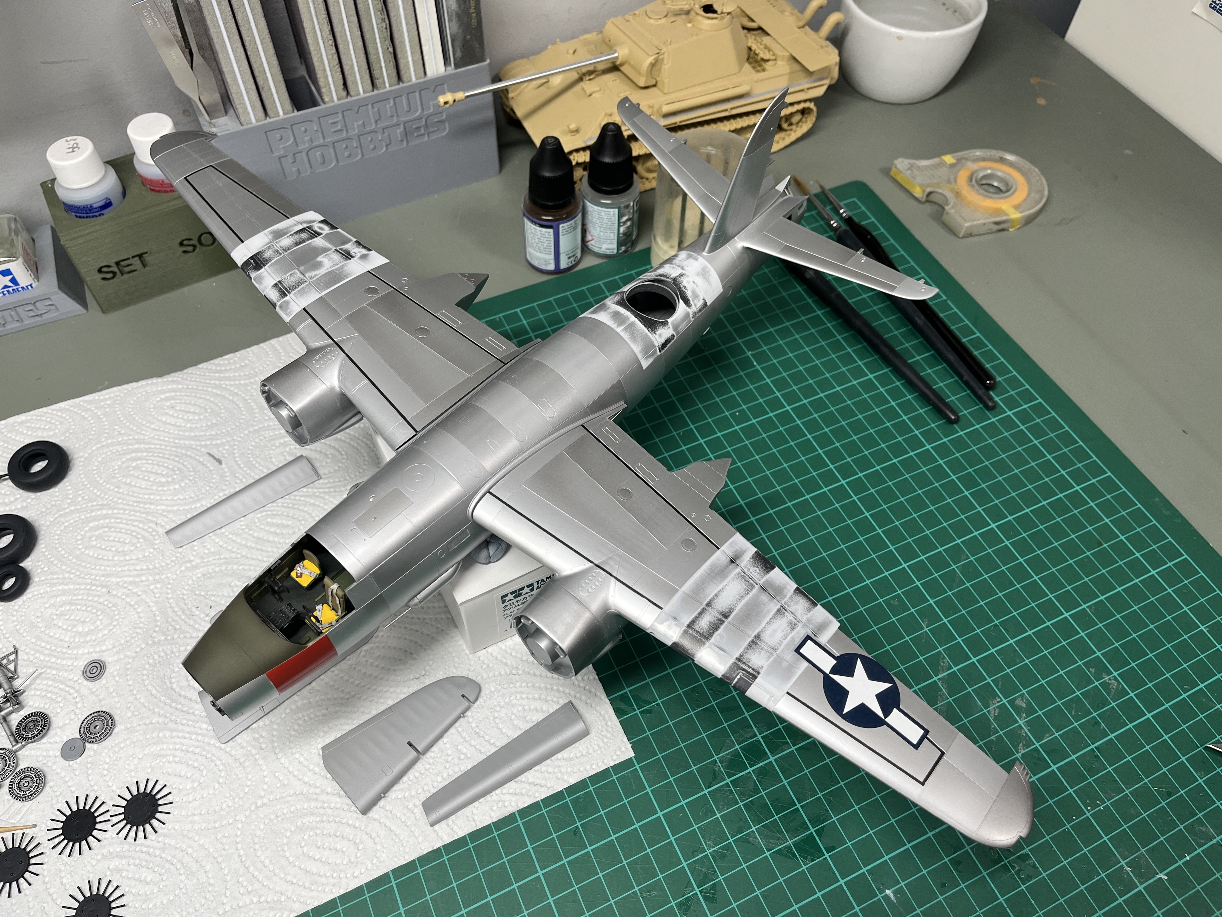 I have to say that choosing a natural material machine in order to cut down on the need for too much masking didn’t really work as I’d hoped it would. In fact, I had way more masking on this model thanks to those dissimilar panels, something that I should have remembered given how many of these schemes I’ve done in the past! Add into that heady little mix my desire to add invasion stripes and in the case of the upper markings, degrade them away, and my simple scheme has been anything but! Still, it’s now getting there so I’m on track to get the thing finished by Wednesday night, all baring any unforeseen cock-ups!