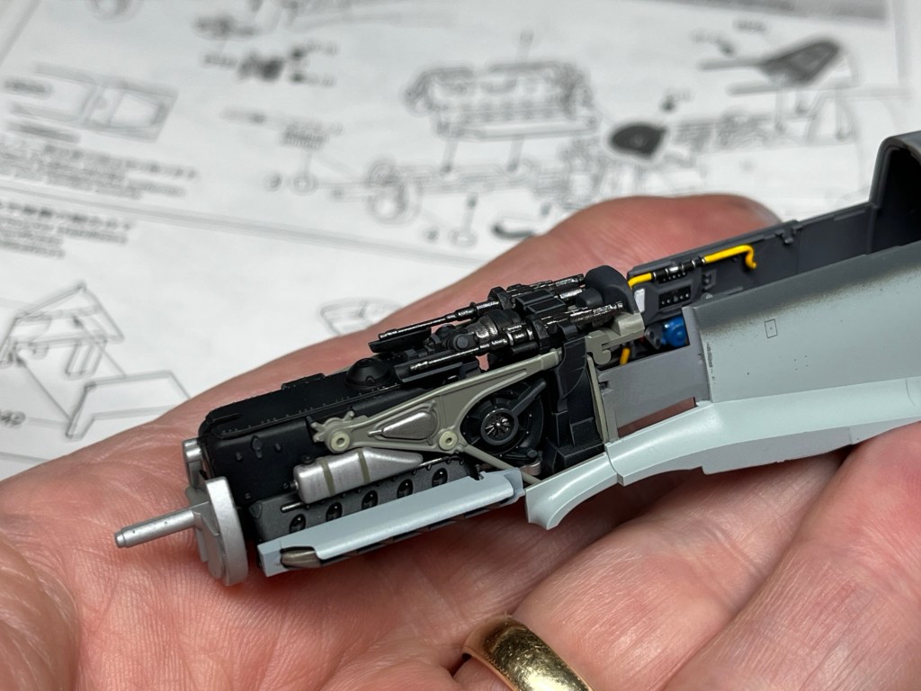 With the house upside down and Liz feeling unwell, I kept out of the way, busying myself with the remaining engine details on the ‘109. As mentioned yesterday, I decided to follow the instructions building and painting as I went along. The result is that I now have a partially completed fuselage complete with cockpit and that engine already in place.